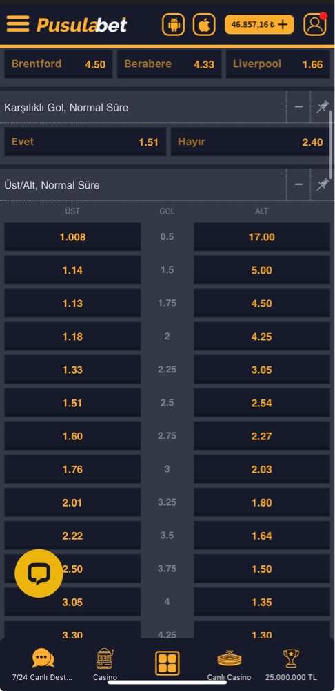 - Karşılıklı Gol Var: Brentford evinde güçlü, Liverpool ise güçlü bir hücum hattına sahip. Pusulabet‘te bu seçeneğin oranı oldukça cazip – 1.51.