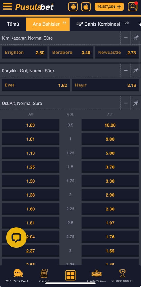 Ana Tahmin: Karşılıklı Gol Var (KG Var). Pusulabet bu seçenek için 1.62 oran sunuyor. Her iki takım da güçlü hücum hatlarına sahip ve ofansif bir oyun tarzını benimsiyor. Brighton geçen sezon iç saha maçlarının çoğunda gol atarken, Newcastle ligin en iyi hücum hatlarından birine sahip.