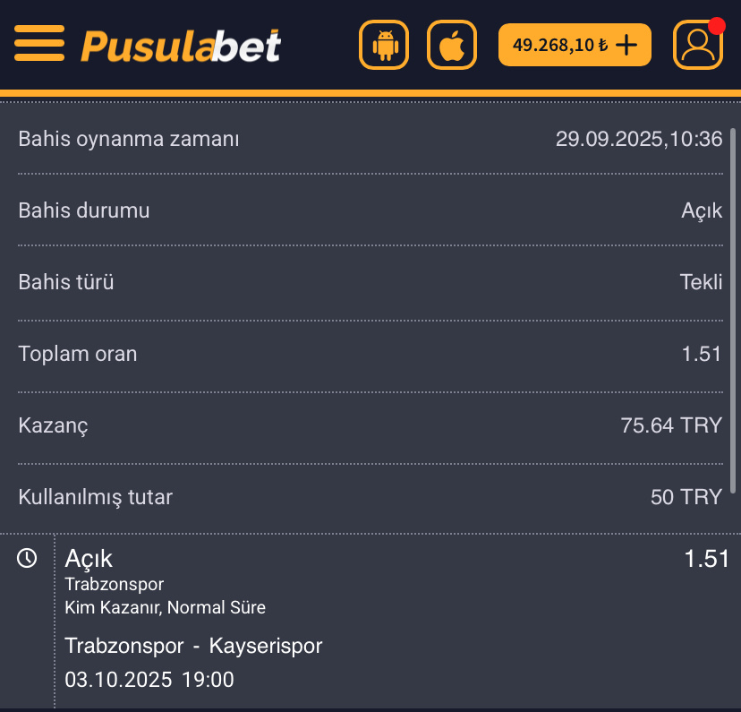 Maç Tarihi: 03.10.2025, 19:00 Maç Bahsi: Normal Sürede Trabzonspor Kazanır Pusulabet Oranı: 1.51 Trabzonspor ve Kayserispor arasında oynanacak olan maç,