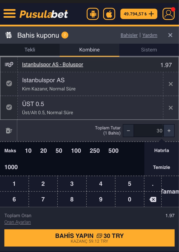 Pusulabet‘te 1.97 oranla sunulan İstanbulspor galibiyeti ve 0.5 gol üstü kombine bahsi, mükemmel bir seçenek olarak öne çıkıyor. Ev sahibi takımın kendi oyununu empoze edip galibiyete ulaşmasını ve maçtaki en az bir golün bu tahmini kazançlı kılmasını bekliyoruz.