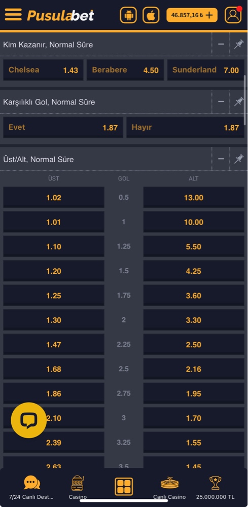 Takımların mevcut form durumları ve aralarındaki maçların geçmişi göz önüne alındığında, Chelsea bu karşılaşmanın mutlak favorisidir. Pusulabet’in ev sahibi galibiyetine verdiği oran 1.43, bu da bu sonucun yüksek bir olasılığa sahip olduğunu gösteriyor. Beraberlik 4.50, Sunderland galibiyeti ise 7.00 olarak oranlandırılmış.