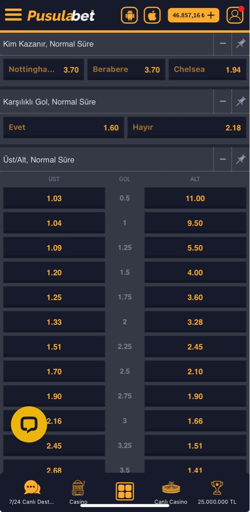 Nottingham’ın zayıf savunması ve Chelsea’nin hücum gücü göz önüne alındığında, en mantıklı bahis konuk ekibin galibiyeti gibi duruyor. Pusulabet’in Chelsea galibiyeti için verdiği 1.94‘lük oran, değerli bir seçenek olarak öne çıkıyor.